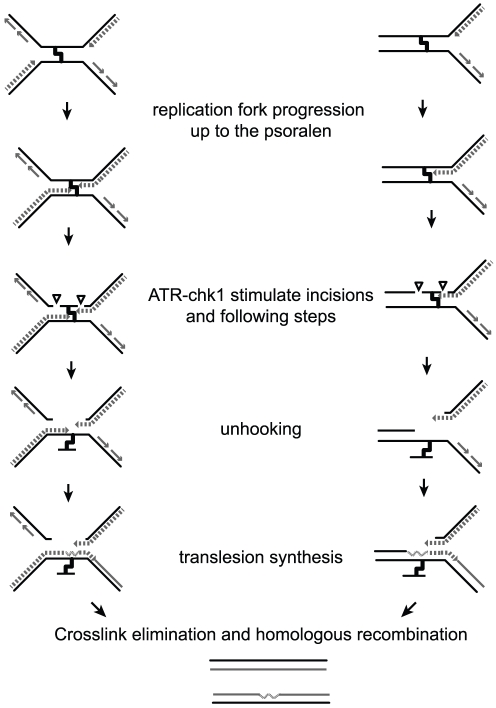Figure 5. Model for psoralen ICL repair in Xenopus egg extract.During replication of plasmid DNA containing a single psoralen ICL, replication forks stall at the ICL advancing up to 1 nt from the lesion. Coordinated incisions of one parental strand around the lesion can occur whether one (right) or both (left) forks have stalled, resulting in unhooking of the lesion. Next, translesion synthesis occurs across the unhooked psoralen adduct and other events implying HR and/or NER regenerate two repaired duplexes as proposed elsewhere [5]. Both incision events and subsequent processing of the broken replication intermediates are stimulated by the ATR-Chk1 pathway.