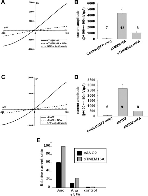 xANO2 as a Ca2+ activated anion channel. (A and C) Representative I–V responses of HEK293T cells expressing xTMEM16A (A), xANO2 (C), or mock control under whole-cell patch-clamp configuration using 4.5 μM Ca2+-containing patch pipette solution. (B and D) Bar graph showing summary of current amplitudes recorded from a holding potential of −100 to +100 mV (mean ± SEM). The anion channel blocker niflumic acid (NFA; 100 μM) was preincubated with cells for 10 min. Number of determinations are indicated on the bar graph. ∗∗∗p < 0.0001 vs. anoctamin-expressing cells with 4.5 μM Ca2+ pipette solution, two tailed t-test. Each B and D bar graphs is depicted for A and C I–V responses. (E) Relative ratios of current amplitude. Each bar was depicted by the calculated percentage for xTMEM16A as full positive current.