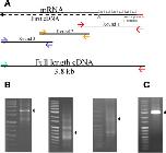 Construction strategy of full-length cDNA. (A) To obtain the full length of xANO2 cDNA, three rounds of PCR were carried out under appropriate conditions. Initial cDNA (dotted line) and PCR products (thick line) are depicted with black lines. 3′-RACE products are represented as Round 1 and 5′-RACE products are represented as Round 2 and 3. (B) PCR products of 3′-RACE (left, Round 1) and 5′-RACE (middle: Round 2, right: Round 3) were electrophoresed in a 1% agarose gel. Black arrowheads indicate the 2.0, 0.7, and 1.7 kb target products. (C) Full-length PCR product of X. laevis TMEM16A gene. The 3012 base pair (bp) cDNA (xTMEM16A) was amplified by gene specific primers: CAN3 and CAN5.