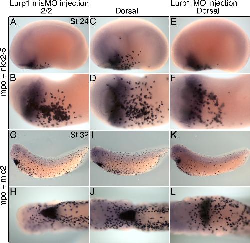 Supl. Fig. 7.Lurp1 mismatch morpholino does not affect Xenopus development. (AâD) Stage 24 embryos injected with the mismatch control morpholino, lurp1-misMO, into both blastomeres at the two-cell stage (A and B), 12 ng dose, or into dorsal blastomeres (C and D). Embryos hybridized to mpo and nkx2-5. (E and F) Sibling embryo injected with the active lurp1 morpholino into dorsal blastomeres at 12 ng dose. (GâJ) Stage 31 tadpoles with the same sequence of mismatch control lurp1 morpholino and hybridized to mpo and mlc2. (K and L) Sibling tadpole injected with the active lurp1 morpholino. Myeloid cell production and embryo development is unaffected by the mismatch control morpholino whereas the active morpholino causes macrophage migration from lateral positions and defective (broader) heart myocardium morphogenesis. |