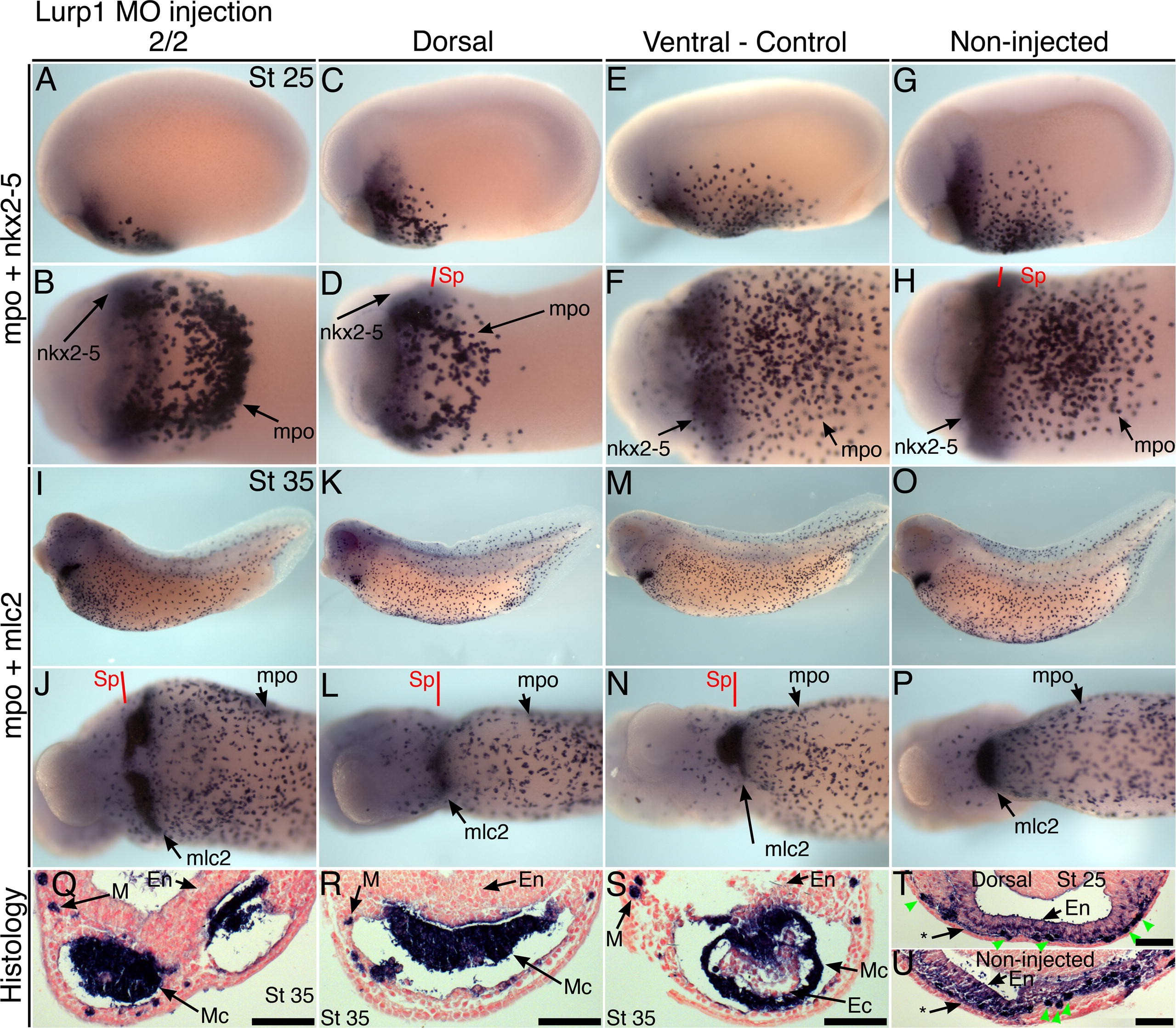 Fig.5. Lurp1 morpholino affects myeloid domain migration and cardiac muscle morphogenesis. (AâH) A stage 25 embryo injected with the lurp1-MO into both blastomeres at the two-cell stage (2/2) (A and B), 12 ng dose. Embryos similarly injected into dorsal blastomeres (C and D), or as a control in ventral blastomeres (E and F), or non-injected sibling (G and H) and hybridized with probes for mpo and nkx2-5. (IâP) Stage 35 tadpoles injected with the lurp1 morpholino, 12 ng dose, with the same sequence of blastomere injections presented and hybridized to mpo and mlc2. Anterior is to the left in lateral and detail ventral views. (QâS) Transverse section through the heart region of tadpoles injected with lurp1 morpholino. Examples of a cardiac bifida phenotype (I, J, Q) and abnormal myocardial folding morphogenesis (K, L, R) were observed in both the two-cell stage and dorsal blastomere injection experiments but never after ventral blastomere injection (M, N, S). (T and U) Stage 25 heart field sections of embryo with dorsal blastomere morpholino (C, D, T) and non-injected sibling (G, H, U). Green arrowheads show dark mpo stain of macrophages. Asterisk (*) denotes mesodermal nkx2-5 stain. NFR-counterstained. Scale bar = 100 μm. Sp, section plane; M, myeloid/macrophage; En, endoderm; Mc, myocardium; Ec, endocardium. |