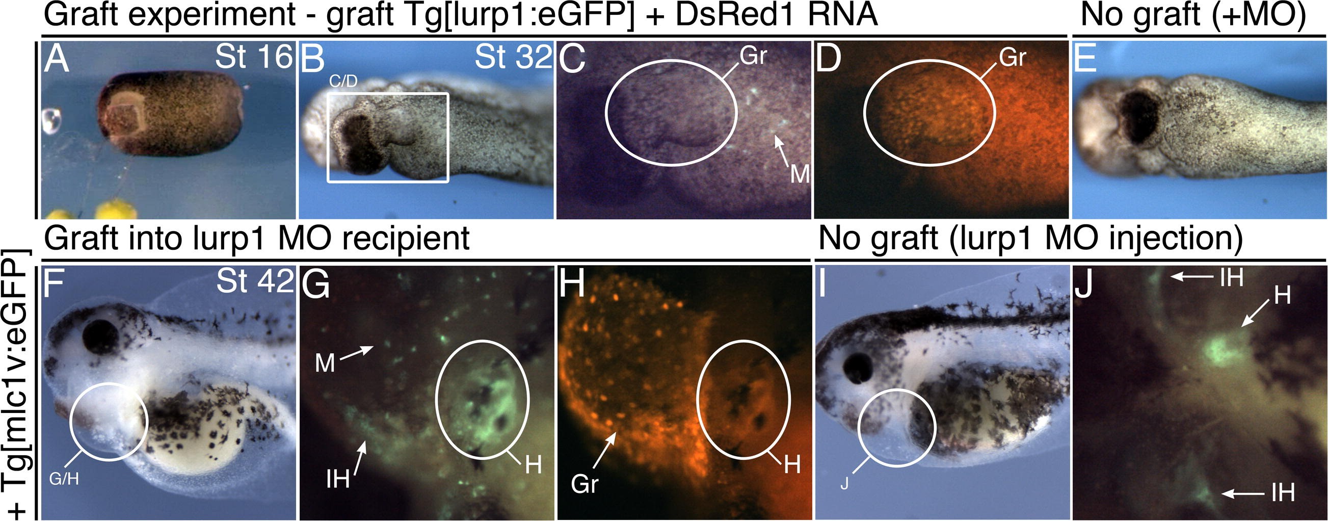 Fig.8. Tissue replacement surgery recovers heart formation defects of macrophage-morpholinos. (AâD) Anterior-ventral tissue replacement surgery was performed at stage 16 between a donor embryo and a recipient embryo (A, Supplementary Movie 1, see Section 4). The donor carries the Tg[lurp1:egfp] transgene and had been injected with DsRed1 RNA into 2/2 blastomeres. The recipient embryo carries the Tg[mlc1v:egfp] transgene and was injected with the lurp1-MO into dorsal blastomeres, 16Â ng dose. Graft recipient tadpole at stage 32 (B). White rectangle (B) shows position of fluorescence images (C-green, migratory macrophages; D-red, graft tissue). (FâH) The same tadpole now at stage 42 has a beating heart. White circle (F) shows position of fluorescence images, ventral view (G-green, donor-macrophages and recipient-heart; H-red, graft tissue). E, I, J: Sibling tadpole injected with lurp1-MO but was not operated on, shown at stage 32 (E) and stage 42 (I and J). The remnant of myocardial tissue does not form a lumen and does not beat (J). Anterior is to left in all views. Gr, graft; M, macrophage; IH, interhyoid facial muscle; H, heart. |