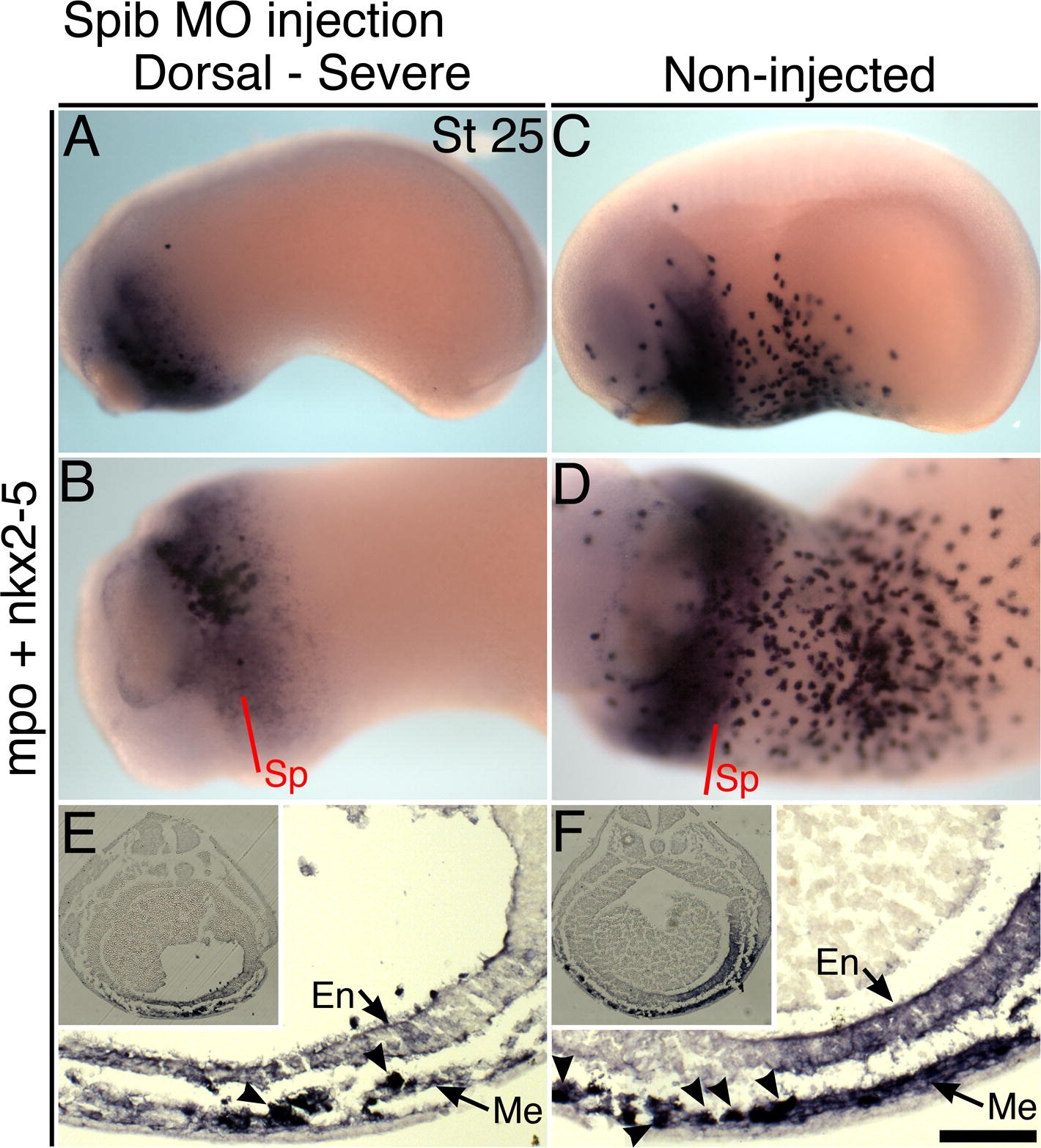 Supplementary Fig. 3 Mesodermal nkx2-5 expression is detected in spib morpholino embryos. (AâD): Stage 25 embryo injected with the Xtspib-e1i1MO into dorsal blastomeres, 40 ng dose (A and B), or non-injected control (C and D). Embryos hybridized to mpo and nkx2-5. (E and F) Transverse sections through the heart field of the embryos. Inset image shows the whole section while main image depicts the region of the ventral midline. Arrowheads indicate dark mpo stain (E and F). NFR-counterstained. Scale bar = 100 μm. Sp, section plane; Me, mesoderm; En, endoderm. |