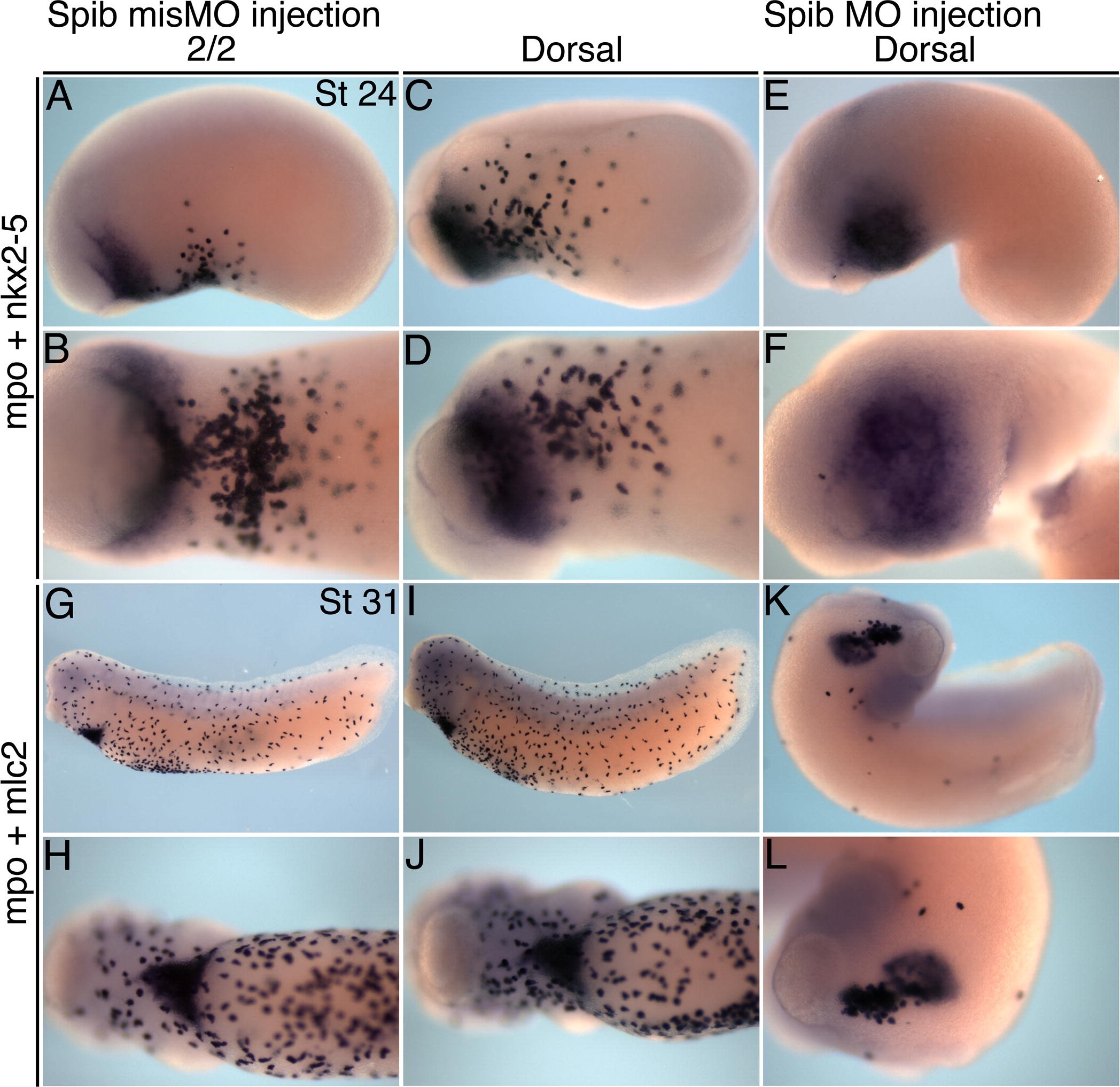 Supplementary Fig. 6 Spib mismatch morpholino does not affect myeloid cell production. (AâD) Stage 24 embryos injected with the mismatch control morpholino, Xlspiba-e1i1misMO, into both blastomeres at the two-cell stage (A and B), 40 ng dose, or into dorsal blastomeres (C and D). Embryos hybridized to mpo and nkx2-5. (E and F) Sibling embryo injected with the active spib morpholino, Xlspiba-e1i1MO, into dorsal blastomeres at 40 ng dose. (GâJ) Stage 31 tadpoles with the same sequence of mismatch control spib morpholino and hybridized to mpo and mlc2. (K and L) Sibling tadpole injected with the active spib morpholino. Myeloid cell production and embryo development is unaffected by the mismatch control morpholino whereas the active morpholino inhibits myeloid development. |