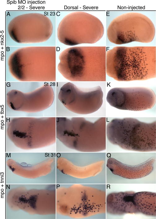 Supplementary Fig. 2 Spib morpholino comparison of bilateral versus dorsal blastomere injection. (A): Tailbud stage 23 embryos injected with Xtspib-e1i1MO, 40 ng dose, into both blastomeres at the two-cell stage (2/2, A and B), into dorsal blastomeres (C and D), or non-injected control (E and F). Embryos hybridized with probes for mpo and nkx2-5. (G): Late tailbud stage 28 embryos, with the same sequence of spib morpholino blastomere injections presented and hybridized to mpo and tbx5. (M): Stage 31 tadpoles with the same sequence of spib morpholino blastomere injections and hybridized to mpo and tnni3. Different morpholino injected embryos were chosen for presentation compared to Fig. 2 and Fig. 3. |