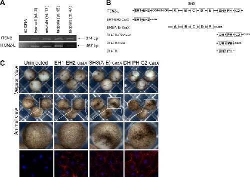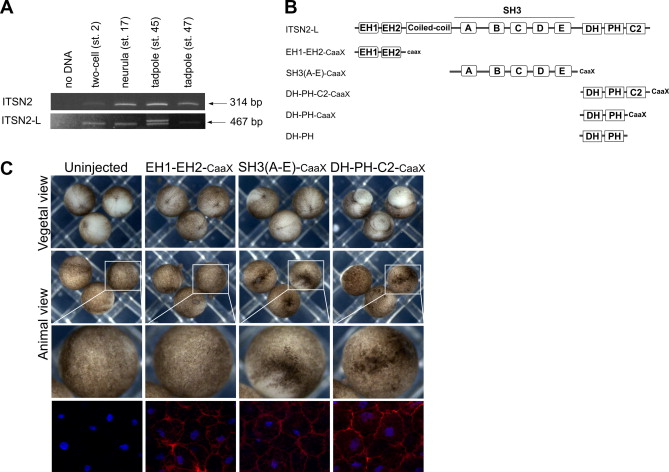 Overexpression of the ITSN2-L domains affects the early development of Xenopus embryos. (A) RT-PCR analysis of ITSN2-L expression in Xenopus embryos. The upper panel shows the overall ITSN2 mRNA that corresponds to both the short and long splice forms of ITSN2. The RT-PCR products were obtained with primers for the sequence encoding the SH3 (AâE) domains. The lower panel shows ITSN2-L detected with primers for the sequence encoding the PH domain. The additional upper band in the sample of stage 45 was non-specific according to the sequencing data. The developmental stage of the embryos is indicated above each lane. (B) Schematic representation of the domain structure of ITSN2-L and the recombinant proteins encoded by the microinjected constructs. EH, Eps15 homology; SH3, Src homology 3; DH, Dbl homology; PH, plekstrin homology; CaaX, membrane-targeting sequence. (C) Two-cell embryos were microinjected with 1 ng of in vitro transcribed mRNA encoding the Myc-tagged EH1âEH2âCaaX domains, the SH3 (AâE)-CaaX domains or the DHâPHâC2âCaaX domains. The images show embryo phenotypes at stage 12.5: vegetal hemisphere (first row), animal hemisphere (second row) and higher magnification of the area enclosed by a rectangle in the second row (third row). Animal caps were dissected at stage 10.25, fixed and stained with an anti-Myc antibody followed by Alexa 546-conjugated secondary antibody (fourth row); the nuclei were stained with DAPI. The experiments were performed three times, and representative data are shown.