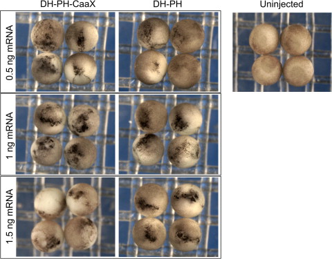 The DH–PH tandem is sufficient to reproduce the phenotype of the embryos induced by the DH–PH–C2-CaaX domains. mRNAs encoding DH–PH–CaaX (left panel) or DH–PH (right panel) were microinjected into the animal pole of two-cell embryos with the amounts indicated. Embryos were raised to the developmental stage 12; the animal hemisphere is shown. An uninjected sibling embryo is shown to the right. The experiments were repeated at least twice with reproducible results.