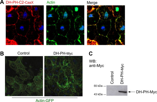 Overexpression of the DHâPH tandem affects the actin cytoskeleton of Xenopus embryos. (A) mRNA encoding DHâPHâC2âCaaX (1 ng) was microinjected into one blastomere of two-cell stage embryos. Animal caps were dissected at stage 10.25, fixed and stained with an anti-Myc antibody followed by Alexa 546-conjugated secondary antibodies. The actin cytoskeleton was detected using Alexa Fluor 488 phalloidin, and nuclei were stained with DAPI. (B) 0.3 ng actin-GFP mRNA alone or together with 1 ng DHâPHâMyc mRNA was microinjected into two-cell stage embryos. Embryos were raised to the developmental stage 10.25, animal caps were then dissected and fixed. The immunofluorescence images represent a single optical section of embryonic cells expressing actin-GFP alone (left) or together with DHâPHâMyc (right). Nuclei were stained with DAPI. (C) The expression of the DHâPHâMyc domains was analyzed with an anti-Myc antibody. Each lane was loaded with protein extracts corresponding to one embryo. WB, western blotting.
