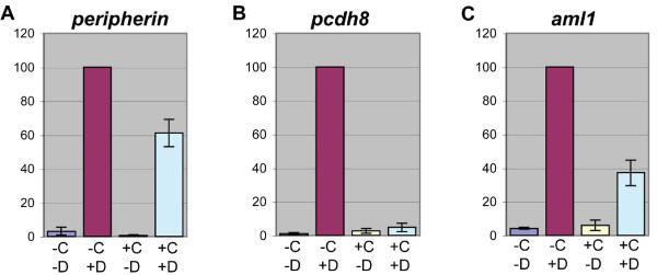 Figure 6. The identification of direct and indirect candidate targets of EBF3 by RT-QPCR. hGR-XEBF3 mRNA and Noggin mRNA were injected into one-cell stage embryos, and animal caps were collected at the blastula stage (stage 9). The animal caps were divided into four groups, based on CHX and DEX treatment: -C-D, -C+D, +C-D, and +C+D. After a 3.5-hour incubation with CHX and/or a 3-hour incubation with DEX, total RNA was isolated from each animal cap group. RT-QPCR was conducted with the isolated total RNA. The expression level was normalized with the expression level of histone h4 and then normalized to the expression level of -C+D, for each gene, at 100 arbitrary units. (A-C) The expression levels of all candidate target genes in controls (-C-D and +C-D) are very low compared to the DEX-treated condition of -C+D. (A) The expression level of peripherin in +C+D (61%) is only partially reduced compared to -C+D, indicating that the majority of its expression is controlled by EBF3 directly. (B) The expression level of pcdh8 in +C+D (5%) is much lower than in -C+D and is similar to the levels of the control conditions, indicating that it is an indirect candidate target. (C) The expression level of aml1 in +C+D (37%) is lower than the expression level in -C+D but higher than levels of the control conditions, indicating that its expression is partially controlled by EBF3 directly. Error bars represent standard error of the mean. The results for the remaining candidate target genes are shown in Additional file 6. N = 3 replicates, 20 to 30 animal caps per condition. |