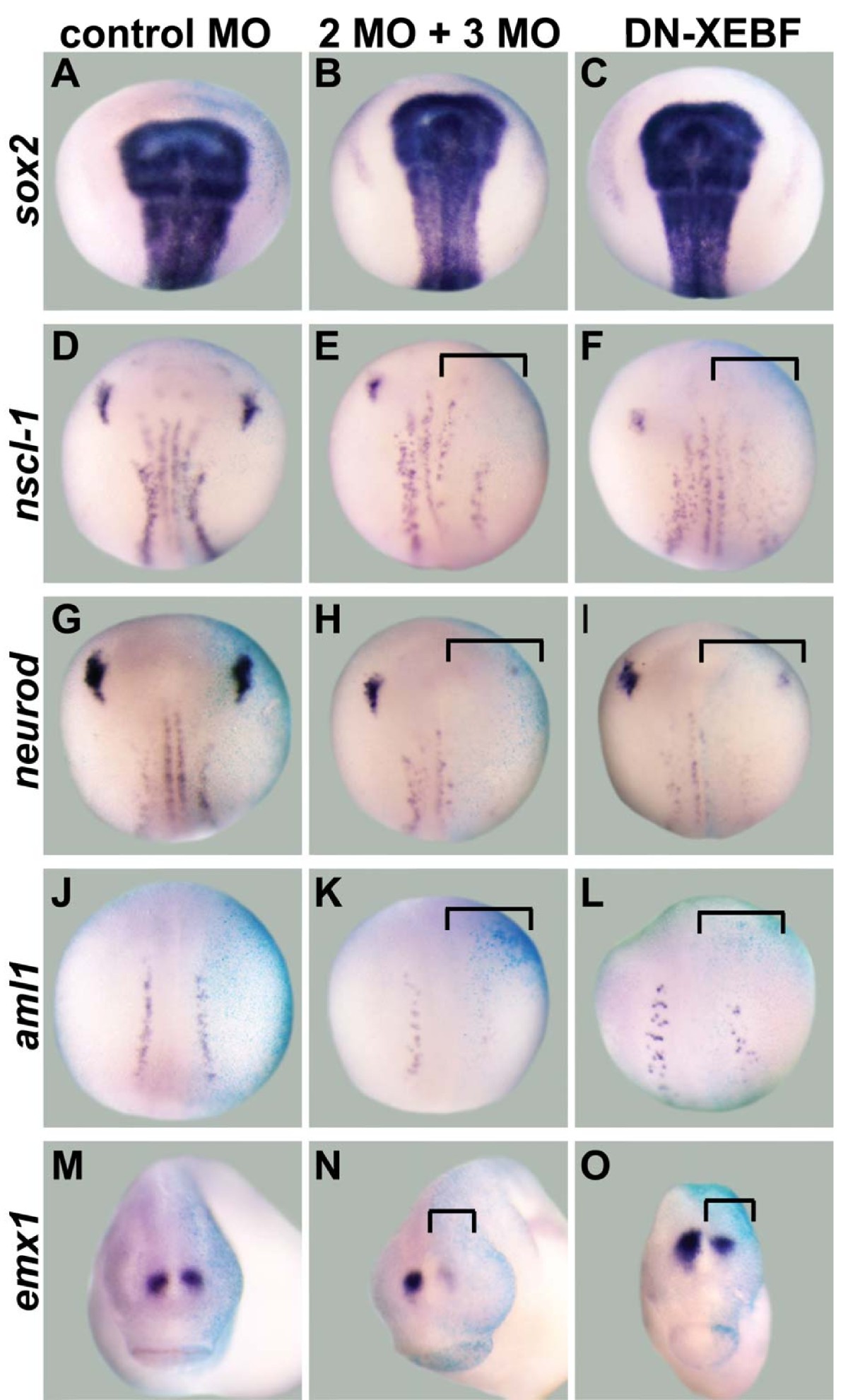 Figure 2. Downregulation of transcription factor candidate target genes after knockdown of EBF2 and EBF3. One cell of two-cell stage embryos was injected with either control MO, both EBF2 MO and EBF3 MO (2MO + 3MO), or dominant negative Xenopus EBF3 (DN-XEBF) mRNA. β-Galactosidase (β-gal) mRNA was co-injected as a marker of the injected side. In all panels the right side is the injected side, showing the light blue color of X-gal staining. (A-C) The expression of sox2 was not changed in all three conditions. (D-O) The expression of nscl-1 (E,F), neurod (H,I), aml1 (K,L), and emx1 (N,O) is downregulated by EBF2 MO and EBF3 MO, and by DN-XEBF (brackets), while control MO does not change their expression levels (D,G,J,M). Panels (A-L) show dorsal views of neurula stage embryos (stage 15/16), and (M-O) are anterior views of tail bud stage embryos (stages 25 to 28). |