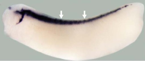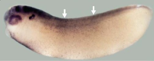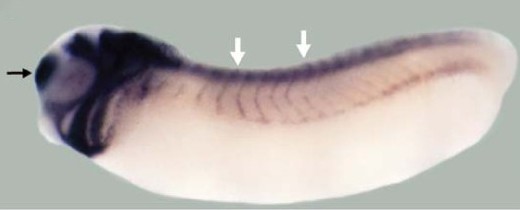 ebf2 (early B-cell factor 2) gene expression in Xenopus laevis embryos, NF stage 28, as assayed by in situ hybridization, lateral view, dorsal up, anterior left. Key: olfactory placode (black arrow); spinal cord (white arrows) |