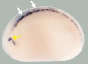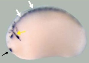 nhlh1 (nescient helix loop helix 1) gene expression in Xenopus laevis embryos, NF stage 23, as assayed by in situ hybridization,lateral view: dorsal up, anterior left. Note trigeminal placode (yellow arrow), olfactory placode (black arrow), domains of the spinal cord (white arrows) |