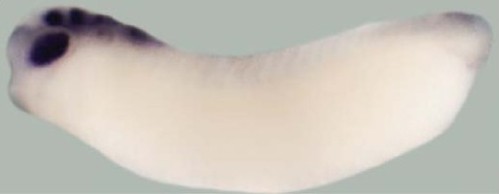 ebf3 (early B-cell factor 3) gene expression in Xenopus laevis embryos, NF stage 28, as assayed by in situ hybridization. Lateral view: dorsal up, anterior left. |