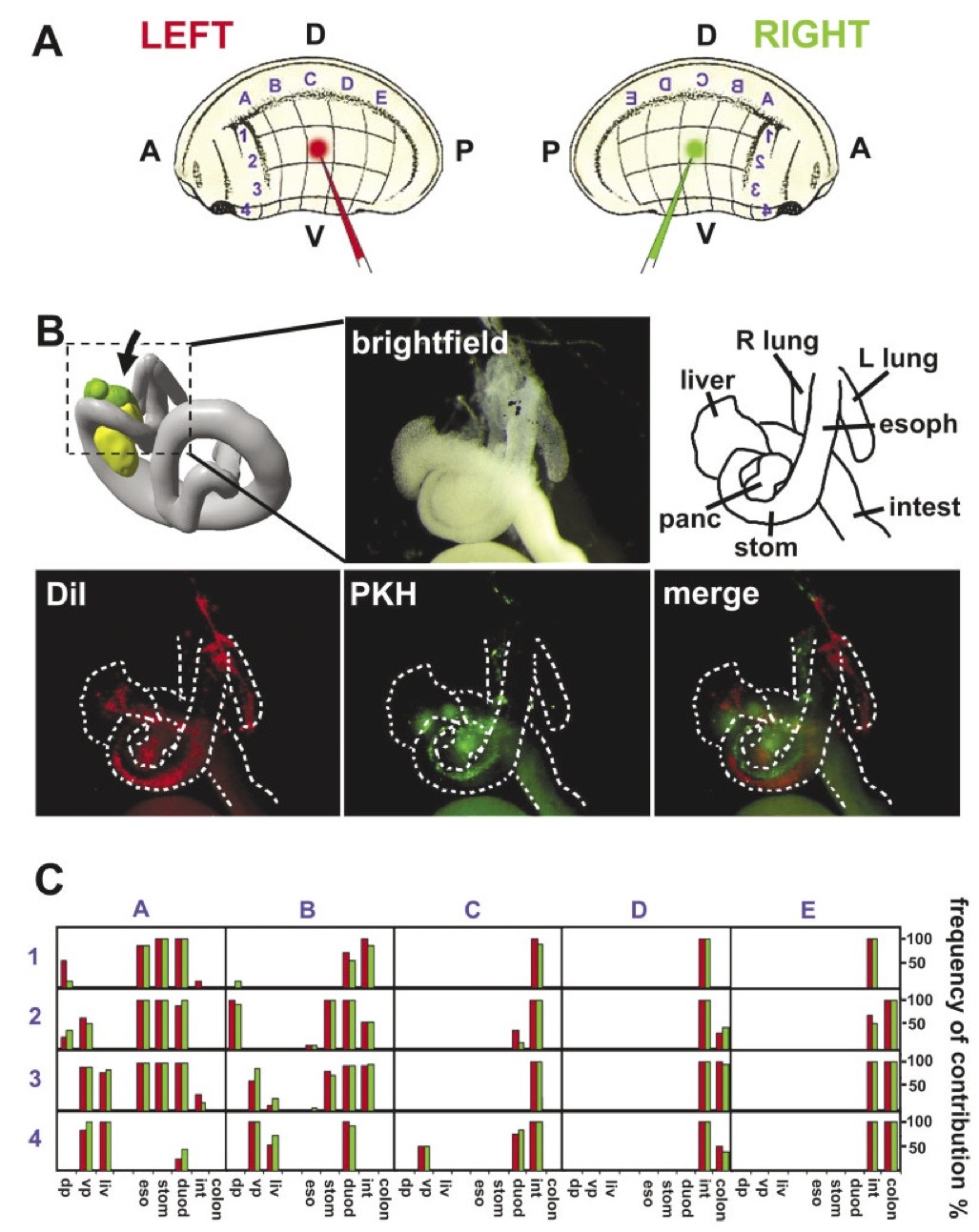 Fig. 1. Contributions of the left and right lateral plate mesoderm to the digestive organs. A: Diagram of bilateral labeling experiment. Individual squares are designated with a letter and number to indicate their relative dorsoventral (1� 4) and anteroposterior (A�E) position in the lateral plate mesoderm (LPM). D, dorsal; V, ventral; A, anterior; P, posterior. B: The fate of left and right squares A3. The region of the gut shown in brightfield is boxed in the model of the stage 45 gut (upper left). The arrow in the box indicates the anterior view of the slightly rotated and flat-mounted foregut organs shown in the photomicrographs. The fluorescence of the left (DiI) and right (PKH) dyes are shown individually and merged. The orientation of specific organs is indicated in the diagram in the upper right. Faint signals in the intestine are autofluorescence. R, right; L, left; esoph, esophagus; panc, pancreas; stom, stomach; intest, intestine. C: Comparison of the frequency of contribution of the left and right LPM to the digestive system, presented as the percentage of cases in which individual left (orange) and right (green) labeled squares contributed to the different digestive organs at stage 45�46. The coordinates of each labeled square are indicated above and to the left of the graphs, with individual organs indicated below. dp, dorsal pancreas; vp, ventral pancreas; liv, liver; eso, esophagus; stom, stomach; duod, duodenum; int, intestine. |