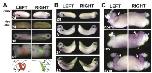Fig. 3. The role of Pitx2 expression in gastroduodenal (GD) looping. A: At stage 24, Pitx2 is expressed in a defined region of the left (arrow) but not right lateral plate mesoderm (LPM), as indicated by RNA in situ hybridization (top panels). Dye-labeled cells within the Pitx2- expressing region in the left LPM will populate the concavity of the GD loop by stage 40 � 41, while cells from the right LPM occupy a convex surface. Schematic drawings of the left and right sides of a stage 41 gut are shown in the bottom panels. d, duodenum; dp, dorsal pancreas; e, esophagus; i, intestine; liv, liver; LL, left lung; RL, right lung; s, stomach; vp, ventral pancreas. B: Expression profile by RNA in situ hybridization of Pitx2 (arrows) in left and right LPM at stages 28�40. C: Isolated gut tubes from heptanol-treated embryos were fixed at stage 40 and subjected to RNA in situ hybridization with a probe for Pitx2. The positions of the GD loop concavities are indicated by arrows. norm, normal; rev, reversed; sym, symetrical. |