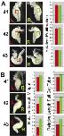 Fig. 5. The left (L) and right (R) sides of the gut elongate at different rates, with no dif- ference in proliferation. A: The number of mitotic cells on the left and right sides of isolated stage 41, 42, and 43 gut tubes was detected with an anti-phosphohistone H3 antibody. The number of mitotic cells within a fixed square area on each side was av- eraged over multiple samples for each stage. Relative proliferation was deter- mined by arbitrarily setting the number of mitotic cells on the right side to a value of 1. B: The lengths of the left and right sides of the midgut (indicated by the orange and green outlines; photos are not to scale) of stage 41, 42, and 43 embryos were digitally measured. Relative mean lengths were de- termined by arbitrarily setting the right side mean to a value of 1. For comparison, the relative mean lengths of the entire left and right sides of the full gut tube were also measured. |