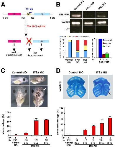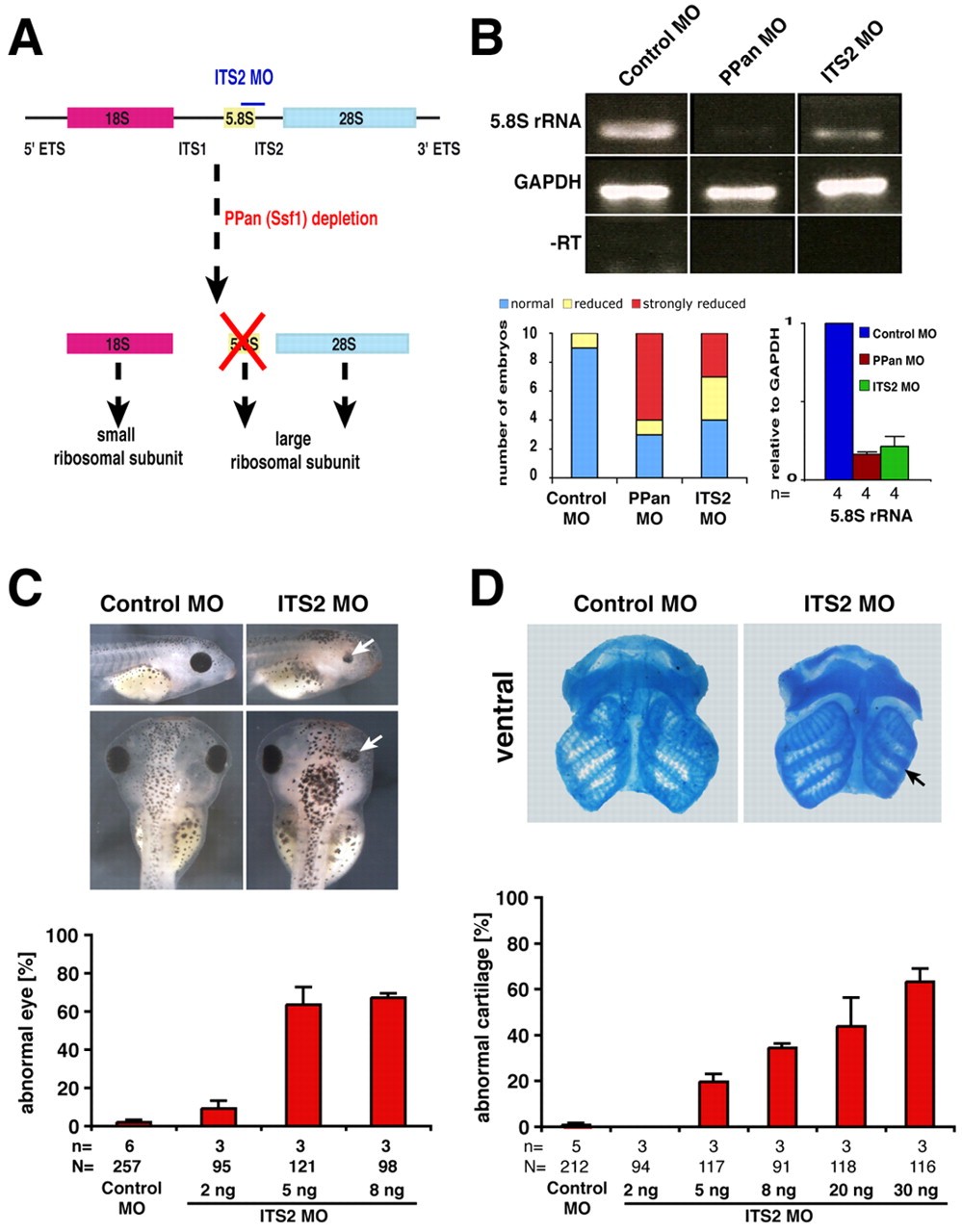 Fig. 3. Interference with ribosome biogenesis phenocopies PPan knockdown. (A) Xenopus 28S, 18S and 5.8S rRNAs are transcribed as a common rRNA precursor separated by the internal transcribed spacers 1 and 2 (ITS1 and ITS2). The binding site of ITS2 MO is indicated. ETS, external transcribed spacer. (B) Both PPan MO and ITS2 MO injection resulted in reduced 5.8S rRNA levels in anterior neural tissue at stage 23. Ten individual explants per MO were analyzed by RT-PCR. The agarose gel shows representative examples for reduced (ITS2 MO) and strongly reduced (PPan MO) signals. qRT-PCR analyses are also given (right). The data are presented as relative units normalized to Control MO-injected samples. (C,D) ITS2 MO injection into one animal-dorsal blastomere at the 8-cell stage results in severe eye (C) and craniofacial cartilage (D) defects in a dose-dependent manner (arrows). Quantitative evaluations are given beneath. n, number of independent experiments; N, total number of embryos examined. Error bars indicate s.e.m. |