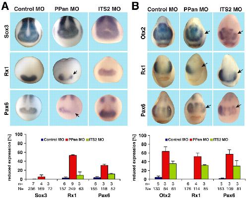 Fig. 4. PPan functions in early eye field induction. (A) Expression of Sox3, Rx1 and Pax6 was analyzed at stage 13. PPan-depleted Xenopus embryos exhibit reduced expression of Rx1 and Pax6 in the eye field (arrows). (B) At stage 23, expression of Otx2, Rx1 and Pax6 was strongly reduced upon PPan MO injection and slightly reduced upon ITS2 MO injection on the affected side (arrows). Quantitative evaluations are given beneath. n, number of independent experiments; N, total number of embryos examined. Error bars indicate s.e.m. |