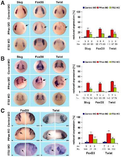 Fig. 5. PPan depletion results in defects in NC induction. (A-C) To study the behavior of NCCs upon PPan MO or ITS2 MO injection, Slug, FoxD3 and Twist expression was analyzed. Slug, FoxD3 and Twist expression at stages 16/17 (A) and 20 (B) as well as FoxD3 and Twist expression at stage 23 (C) was reduced on the injected side upon PPan depletion, whereas ITS2 MO injection had little or no effect on NC specification and migration (arrows). Quantitative evaluations are given to the right. n, number of independent experiments; N, total number of embryos examined. Error bars indicate s.e.m. |