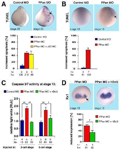 Fig. 8. PPan has a function in apoptosis. (A) Eight-cell stage Xenopus embryos were injected with PPan MO (5 ng) or Control MO (5 ng) into one animal-dorsal blastomere. TUNEL staining was used to label apoptotic cells. PPan depletion results in increased apoptosis on the manipulated side at stage 23 (arrow), which could not be rescued by co-injection of p53 MO (5 ng). Control MO-injected embryos were not affected. A quantitative evaluation is given beneath. (B) The increase in apoptosis can already be observed at stage 13. (C) Bilateral injection of 40 ng PPan MO at the 2-cell stage leads to increased activity of caspases 3 and 7. This effect can be reverted by co-injection of 4 ng human (h) BCL2 RNA. The same effect was observed upon injection (bilateral, animal-dorsal) of 10 ng PPan MO and 2 ng human BCL2 RNA at the 8-cell stage. Values represent relative light units (RLU) normalized to one Control MO-injected sample per series of experiments. (D) Co-injection of 1 ng human BCL2 RNA into one animal-dorsal blastomere at the 8-cell stage rescued the PPan MO-induced reduction of Rx1 expression (arrow). **, P<0.01; *, P<0.05. n, number of independent experiments; N, total number of embryos examined. Error bars indicate s.e.m. |
