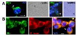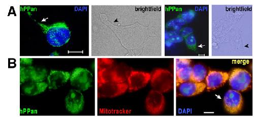 Fig. S10. PPan is located in the mitochondria. (A) Comparison of PPan immunostainings and brightfield images clarify the localization of PPAN in extranuclear compartments of HEK293 cells (arrows). (B) Counterstaining of the mitochondria using MitoTracker Red CMXRos revealed that PPAN is located in the mitochondria. The arrow points to the cell shown in Fig. 9. Scale bars: 10 . |