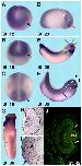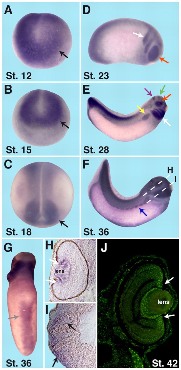 Fig. 1. The spatial expression pattern of X. laevis PPan. (A-C) PPan is expressed in the neural plate (arrows), as monitored from stage 12 to 18. (D) At stage 23, PPan transcripts accumulate in the eye (red arrow), the cranial neural crest cells (NCCs; white arrow), and in the posterior part of the embryo (left). (E) Arrows point to the different PPan expression domains at stage 28: eye (red), forebrain (green), midbrain (violet), branchial arches (white) and pronephros (yellow). (F,G) PPan is expressed in the hypaxial muscles (F, arrow) and the blood islands (G, arrow) at stage 36. (H) Transverse section (plane indicated in F) of the eye at stage 36 shows PPan expression in the ciliary marginal zone (CMZ; arrows) and in the lens. (I) Transverse section (plane indicated in F) at stage 36 indicates PPan expression in the branchial arches (arrows). (J) Transverse section of the eye shows PPan protein localized in the CMZ (arrows) and in the lens. |