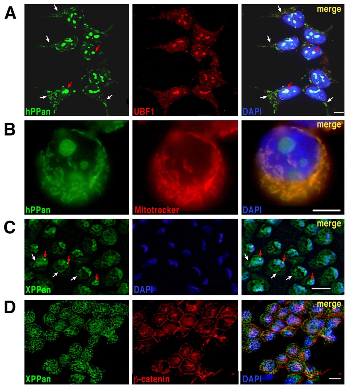 Fig. 9. Cellular localization of PPan. (A) Immunofluorescence staining of human PPAN (hPPan) and UBF1 in HEK293 cells by use of specific antibodies. The overlay shows the colocalization (red arrows) of PPAN (green) and UBF1 (red). White arrows indicate extranuclear PPAN. Nuclei are visualized by DAPI staining (blue). (B) PPAN is located in the mitochondria of HEK293 cells as shown by counterstaining with MitoTracker Red CMXRos. (C) Neuralized AC cells equivalent stage 13 were dissociated and stained for PPan (green). Xenopus (X) PPan is localized to the nucleoli (red arrows) and in the cytoplasm (white arrows) of neural cells. (D) Immunofluorescence staining in attached cells from untreated ACs revealed that Xenopus PPan (green) can be found in the cytoplasm but not at the cell membrane, which is labeled by β-catenin staining (red). Scale bars: 10 μm in A,B; 20 μm in C,D. |