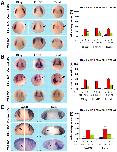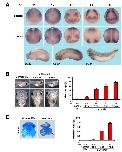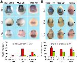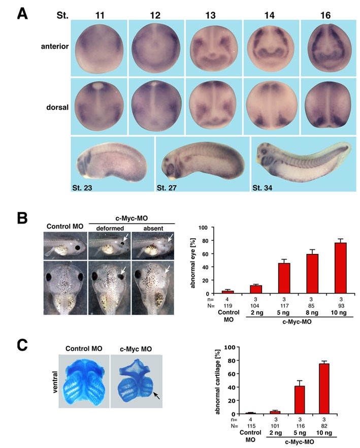 Fig. S7. c-Myc knockdown phenocopies PPan depletion. (A) c-Myc expression monitored from stage 11 to 16 and later stages. c-Myc transcripts are located in the prospective neural crest region first detectable at stage 11 and, in addition, in the eye field first visible at stage 13. At later stages, c-Myc has expression domains similar to those of PPan, e.g. in the branchial arches, the eye, the pronephros the forebrain and midbrain, the hypaxial muscles and the blood islands. (B,C) c-Myc MO (Bellmeyer et al., 2003) was injected into one animal-dorsal blastomere at the 8-cell stage. c-Myc depletion results in severe eye (B) and craniofacial cartilage (C) defects (arrows) in a dose-dependent manner. n, number of independent experiments; N, total number of embryos examined. Error bars indicate s.e.m. |