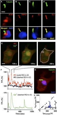 Shh and second-messenger signaling converge at the neuronal primary cilium. (A) Immunostaining of immature spinal neurons grown in vitro for 7 h. Acetylated tubulin staining is shown in green, and DAPI staining is shown in blue. (A) IP3R (red) localize at the base of the primary cilium. (B) TRPC1 (red) localizes to the primary cilium. (C and D) Gαi protein (red) localization at the primary cilium expands when Shh signaling is enhanced. Numbers correspond to the mean SEM percent of acetylated tubulin labeling that overlaps with Gαi staining at the primary cilium in the absence (C) or presence (D) of 100 nM SAG for 4 h. n = 10 cells per condition; *P < 0.005. (E and F) Simultaneous Ca2+ and IP3 imaging reveals synchronous transients. (E) Images correspond to a time before (Left), during (Center), and after (Right) the spike indicated in the trace in F. (F) Traces represent the changes in fluorescence intensity for IP3 and Ca2+ probes in regions of interest (ROI) indicated in E, Right. (G) IP3 transients are apparent at the primary cilium. The cell is the same shown in E, stained with DAPI (blue) and anti-acetylated tubulin (green) and overlapped with IP3 frame (red) corresponding to the peak of the transient shown in E, Center. (Scale bars, 10 μm.) (H) Synchronicity of Ca2+ and IP3 transients. Graph represents onset time of Ca2+ spikes vs. onset time of IP3 transients during simultaneous recordings. Inset represents the histogram of the difference between onset times; Δt = tIP3 − tCa2+.