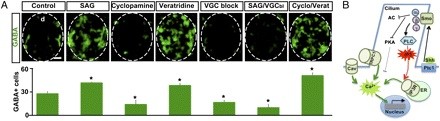 Ca2+ spike activity is necessary for Shh-induced spinal neuron differentiation. (A) (Upper) Immunostaining of transverse sections of the spinal cord from embryos treated with agents indicated in the figure. Cyclo, cyclopamine; d, dorsal; Verat, veratridine; VGC block and VGCbl, voltage-gated Na+ and Ca2+ channel blockers. (Lower) Graph shows mean SEM GABA-immunopositive cells/100 μm of spinal cord. n ≥ 5 stage-34 (45-h postfertilization) embryos per experimental group; *P < 0.05. (Scale bar, 20 μm.) (B) Model of the molecular mechanisms underlying Shh-induced Ca2+ spikes. α, β, γ, subunits of the heterotrimeric G protein; AC, adenylate cyclase; Cav, voltage-gated Ca2+ channels; ER, endoplasmic reticulum; Ptc1, Patched1. Details are given in Discussion.