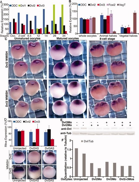 Figure 1. Dvl2 and Dvl3 expression profile and maternal depletion strategies. A: Real-time PCR (RT-PCR); Dvl2 (black bars) and Dvl3 (red bars) are present in oocytes' cDNA, Dvl1 (green bars) is not detected before st12; ODC (blue bars) is used as RNA loading control. B: Dvl2 and Dvl3 are more abundant in animal halves as compared to vegetal halves. Data from 2 independent experiments were averaged; Foxi2 and VegT are controls for animally and vegetally restricted transcripts, respectively. C: Whole mount in situ hybridization (WMISH) on bisected oocytes and embryos; Dvl2 and Dvl3 are detected in the animal cytoplasm of oocytes and animal hemisphere of 8-cell-stage embryos. D: Four nanograms of Dvl2 antisense oligo (Dvl2AS) successfully deplete Dvl2 but not Dvl3. Conversely, 10 ng of Dvl3 antisense oligo (Dvl3AS) successfully depletes Dvl3 but not Dvl2. E,F: Western blot analysis; 60 ng of Dvl2 or Dvl3 antisense Morpholino oligo (Dvl2Mo or Dvl3Mo), or a mixture of 30 ng of each (Dvl2 + 3 Mos) reduces the amount of proteins to about 50% of the control. Alpha-tubulin (Tub) is used as protein-loading control and the quantification represents the ratio of Dvl and Tubulin signals.Download figure to PowerPoint