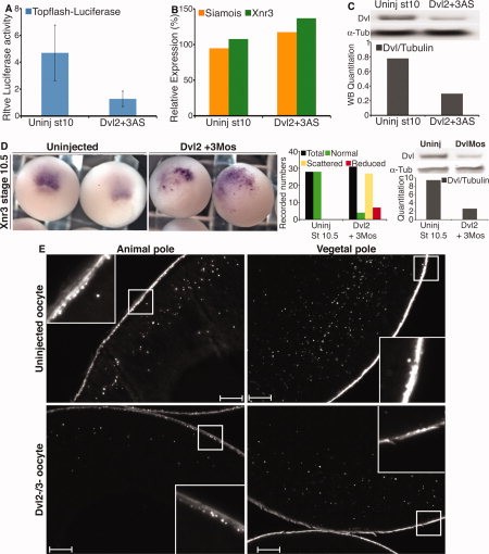 Figure 4. Effect of maternal Dishevelled depletion on canonical Wnt signaling. Reduced activity of the Topflash reporter in Dvl2- and Dvl3-deleted embryos. B: Siamois and Xnr3 are not reduced in Dvl2/3-depleted siblings in A. C: Western blot analysis shows a reduction of Dvl protein to 38% of the control in Dvls-depleted siblings in A. D: WMISH analysis of Xnr3 expression. Xnr3 is confined to the organizer at stage 10.5 in control embryos (Uninjected, first panel). In Dvl2/3-depleted embryos (Dvl2 + 3Mos, second panel), the signal for Xnr3 is not restricted to the organizer. Similar results were obtained in three independent experiments (scoring graph, third panel). Dvl2/3 protein was reduced to about 30% of the control in these experiments as shown by Western blot (fourth panel). E: Immunofluorescence staining of oocyte paraffin sections with a Dishevelled-specific antibody (anti-Dvl(c-19)). Dvl protein is in cytoplasmic and submembranous punctae in the control (two top panels), as well as more diffuse submembranous staining. The depletion causes a loss of juxtamembrane diffuse staining and cytoplasmic punctae (two bottom panels), but submembranous punctae are still visible. Insets represent a magnification of the boxed area in the corresponding panel. The specificity of the anti-Dvl(c-19) antibody was confirmed by double immunostaining of animal caps injected with Myc-Dvl2 mRNA, in which the anti-Dvl(c-19) signal completely overlapped with the anti-Myc signal (data not shown). Scale bars = 50 μm.Download figure to PowerPoint