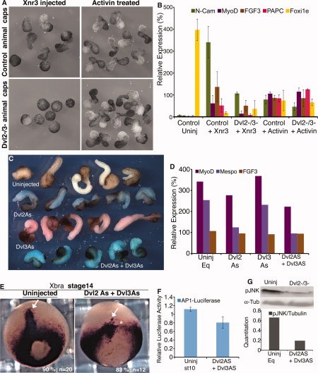 Figure 5. Requirement of maternal Dvl2 and Dvl3 for convergence extension. A: Animal caps (caps) at sibling neurula stage 17. Xnr3 induces the elongation of controls (top left) but not Dvl2/3-depleted (bottom left) caps. Activin induces the elongation of both control (top right) and Dvls-depleted (bottom right) caps. B: Induction by Xnr3 of the expression of N-Cam, MyoD, FGF3, and PAPC is reduced in Dvl2/3-depleted caps, but their induction by activin is comparable in control and Dvls-depleted caps. Foxi1e is highly expressed in uninjected caps, and is severely reduced by Xnr3 and activin in both control and Dvl2/3-depleted caps. C: Equatorial zones (Equators) dissected at stage 9. As compared to controls (brown), Dvl2- (mauve) or Dvl3- (red) depleted Equators are relatively normal; double depleted (blue) explants show a minor elongation defect. D: The expression of MyoD, Mespo, and FGF3 show minor changes upon Dvl2/3 depletion. E: WMISH analysis. In Dvl2/3-depleted embryos (right), the ring of Xbra expression has a dorsal gap (white star) and the midline expression domain is severely reduced (arrow). F: Reduction of the relative AP1-luciferase activity in Dvl2/3-depleted embryos (P = 0.04). G: Western blot shows phospho-JNK levels in control and Dvl2/3-depleted equatorial zones frozen at stage 10.Download figure to PowerPoint