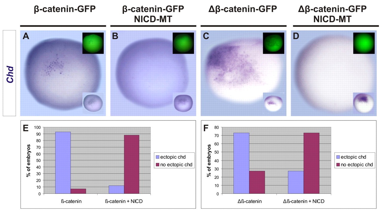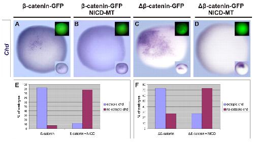 Fig. 2. Notch impairs the ability of β- and δβ-catenin to induce ectopic expression of the blastula chordin- and noggin-expressing centre (BCNE) marker chd at the ventral side. (A-D) Expression of the BCNE marker chd in whole Xenopus embryos at stage 9. Embryos were injected into one ventral blastomere at the 4-cell stage with the following mRNAs: 1 ng of β-catenin-GFP (A), 1 ng of β-catenin-GFP + 1 ng of nicd-mt (B), 1 ng of δβ-catenin-GFP (C) or 1 ng of δβ-catenin-GFP + 1 ng of nicd-mt (D). All embryos are shown in ventral views. The upper insets show the immunofluorescence revealing the DOG tracer at the ventral side. The lower insets show the corresponding dorsal views with the normal expression of chd in the BCNE. (E,F) Percentage of embryos expressing (blue bars) or not expressing (red bars) ectopic chd at the ventral side. (E) Comparison of β-catenin-GFP (left) and β-catenin-GFP + nicd-mt injections (right). (F) Comparison between δβ-catenin-GFP (left) and δβ-catenin-GFP + nicd-mt injections (right). |