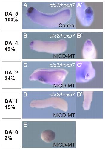 Fig. 3. Notch gain of function produces ventralised phenotypes. Xenopus embryos were injected with 1 ng of nicd-mt RNA before the first mitotic division and were allowed to develop until stage 28, when they were scored according to the dorsoanterior index (DAI) (Kao and Elinson, 1988). DAI 5, normal; DAI 4, reduced eyes and forehead; DAI 2, microcephalic; DAI 1, acephalic; DAI 0, bauchstück. The percentage corresponding to each phenotype is shown at the left (n=47). (A,Aâ²) Lateral (A) and frontal (Aâ²) views of a sibling control embryo hybridised with the cephalic marker otx2 (Pannese et al., 1995; Blitz and Cho, 1995) and the posterior marker hoxb7 (López and Carrasco, 1992; Godsave et al., 1994). (B-Dâ²) Lateral (B-D) and frontal (Bâ²-Dâ²) views of embryos injected with nicd-mt RNA and hybridised with otx2 and hoxb7. Note the loss of cephalic structures at different grades, as revealed by otx2 expression. (E) An extremely ventralised embryo injected with nicd-mt mRNA. |