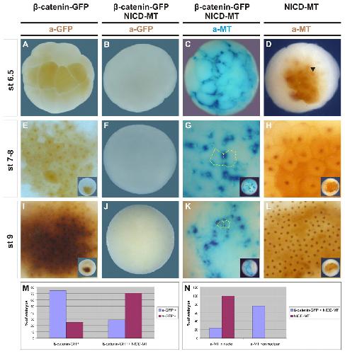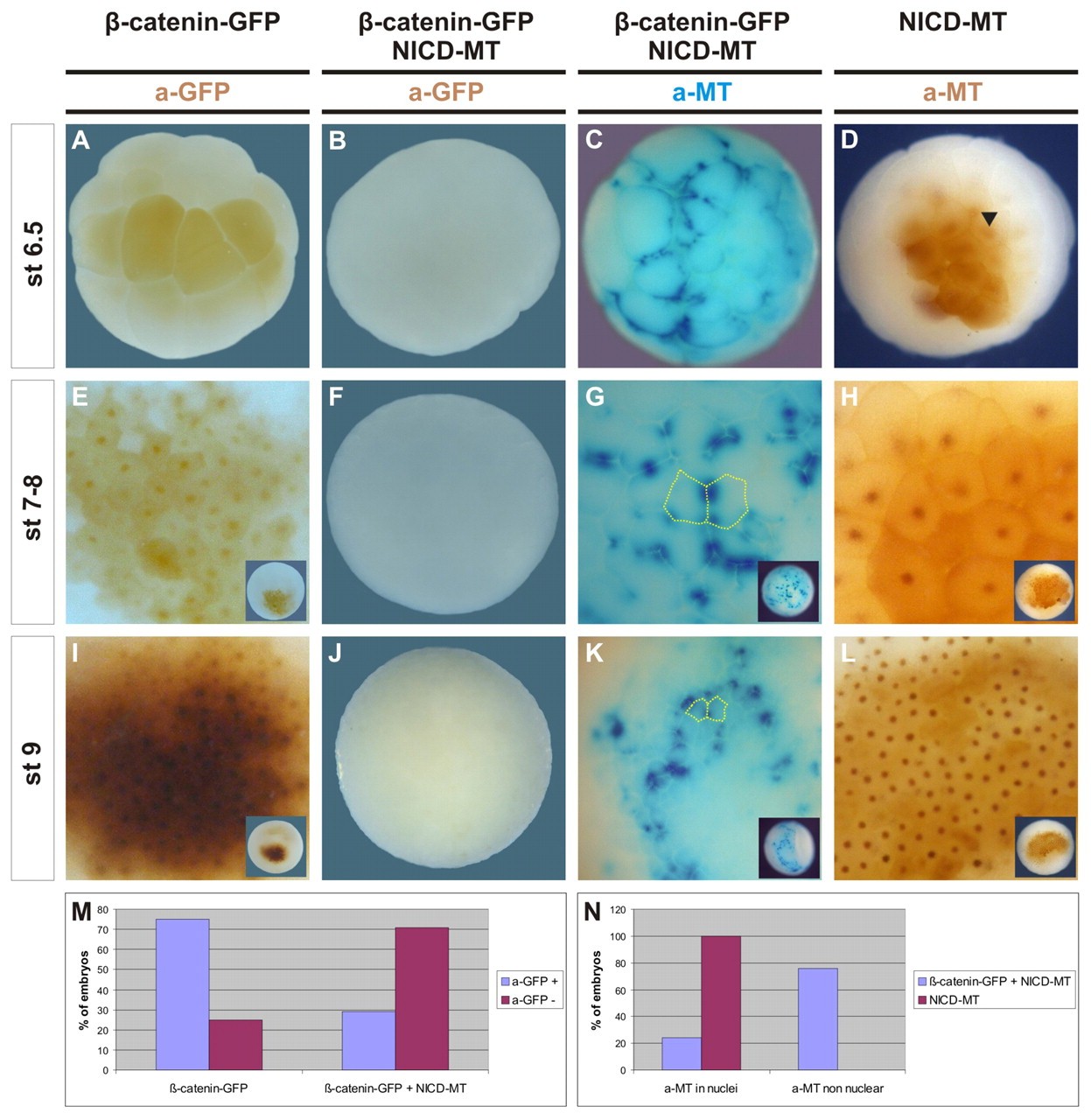 Fig. 5. Notch decreases the steady state levels of exogenous β-catenin. (A-L) Xenopus embryos were injected with 1 ng of β-catenin-GFP mRNA (A,E,I), 1 ng of β-catenin-GFP mRNA + 1 ng of nicd-mt mRNA (B,C,F,G,J,K) or 1 ng of nicd-mt mRNA alone (D,H,L). Embryos were fixed at stage 6.5 (A-D), 7-8 (E-H) or 9 (I-L). They were processed for immunohistochemistry with antibodies against GFP (A,B,E,F,I,J) or c-myc (C,D,G,H,K,L) and revealed with HRP/DAB (A,B,D-F,H-J,L; brown) or alkaline phospatase/BCIP (C,G,K; turquoise). All embryos are shown in animal views. E, G, H, I, K and L are magnifications of the embryos shown in the insets. The arrowhead in D points to the nuclear localisation of NICD-MT. The dotted yellow line in G and K depicts the intercellular boundary around two neighbouring animal cells. Notice the turquoise foci revealing the localisation of NICD-MT at both sides of the boundary, in cell-cell junctions. (M) Percentage of embryos expressing the recombinant β-catenin-GFP protein (a-GFP+, blue bars) or not expressing it (a-GFPâ, red bars). Comparison of β-catenin-GFP (left) and β-catenin-GFP + nicd-mt injections (right). (N) Percentage of embryos with nuclear (left) or without nuclear expression of the recombinant NICD-MT protein, which is instead relocated to cell-cell junctions (right). Comparison of β-catenin-GFP + nicd-mt injections (blue bars) and nicd-mt injections (red bars). |
