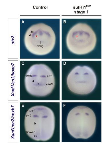 Fig. S3. Attenuation of CSL-mediated Notch signalling does not result in an expansion of the brain. (A-F) Expression of anterior-posterior (A-P) neural markers at stage 15 in control Xenopus embryos (A,C,E) and sibling embryos injected with 2 ng of su(H)1DBM mRNA (B,D,F). Embryos were injected prior to the first cleavage in the animal hemisphere and were processed for whole-mount in situ hybridisation for the following markers: otx2 (A,B); Xanf1, en2 and hoxb7 (C-F). A-D show anterior views, dorsal up. E and F are dorsal views of the embryos shown in C and D, respectively; anterior up. Asterisks in A and B highlight the expression hole encircled by otx2, which is conserved in su(H)1DBM-injected embryos. shcg, stomodeal-hypophyseal and cement gland anlage; t, presumptive telencephalon; d, presumptive diencephalon; m, presumptive mesencephalon; m/h, presumptive boundary between midbrain and hindbrain; h, presumptive hindbrain; sc, presumptive spinal cord. |