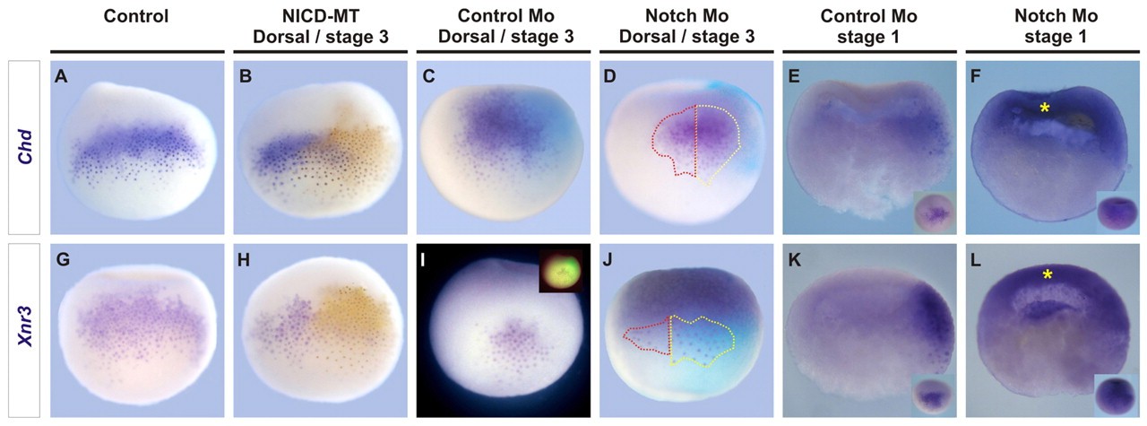Fig. 1. Notch restricts the expression of blastula chordin- and noggin-expressing centre (BCNE) markers to the dorsal region. Expression of chd (A-F) and Xnr3 (G-L) in stage 9 Xenopus embryos. (A,B,G,H) Embryos injected with 1 ng of nicd-mt mRNA into a dorsal cell at the 4-cell stage (stage 3; B,H) and control siblings (A,G). Brown dots correspond to horseradish peroxidase immunolocalisation of the c-myc epitope fused to the intracellular domain of Notch (NICD). (C,D,I,J) Embryos injected with 20 ng of control morpholino (Mo; C,I) or Notch Mo (D,J) into a dorsal cell at stage 3. The injected side was revealed by alkaline-phosphatase immunostaining of the fluorescein tag (BCIP, turquoise staining in C,D,J) or by immunofluorescence (inset in I). Red and yellow dotted lines depict the area of expression of the BCNE markers on the non-injected and on the injected side, respectively. (E,F,K,L) Hemisectioned embryos injected with 20 ng of control Mo (E,K) or Notch Mo (F,L) before the first cleavage. The dorsal side is oriented to the right, animal up. Insets in E, F, K and L show the corresponding whole embryos. Whole embryos are shown in dorsal views, animal up. |