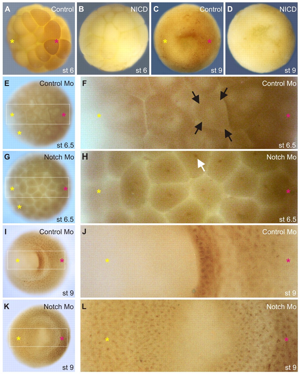 Fig. 7. Notch modulates the levels and the intracellular distribution of endogenous β-catenin. (A-L) Immunolocalisation of endogenous β-catenin in whole Xenopus embryos. Embryos were injected before the first mitotic division with 1 ng of nicd-mt mRNA (B,D), 20 ng of control morpholino (Mo; E,F,I,J) or 20 ng of Notch Mo (G,H,K,L). Injected embryos and their corresponding uninjected siblings (A,C) were fixed at early blastula (A,B,E-H) and late blastula (C,D,I-L) and were processed for whole-mount immunohistochemistry with an antibody raised against the last C-terminal 14 amino acids of β-catenin (brown). All embryos are shown in animal views, with the dorsal side oriented to the right, except in B, where it was not possible to assign the dorsal-ventral (D-V) orientation. F, H, J and L are magnifications of the area enclosed by the rectangular frame in E, G, I and K, respectively. Embryos were photographed in PBS (A-D) or in 75% Murray's solution in methanol (E-L). Uninjected controls (A,C) or embryos injected with control Mo (E,I) show a D-V gradient of β-catenin immunoreactivity, with fainter levels ventrally (yellow asterisks) and maximum levels dorsally (red asterisks). Notch Mo increased the levels of β-catenin protein on the ventral side relative to control Mo-injected siblings (compare yellow asterisks in E,F and G,H for stage 6.5 and in I,J and K,L for stage 9). Black and white arrows indicate the distribution of β-catenin in the peripheral cytoplasm and in the nuclei, respectively. |