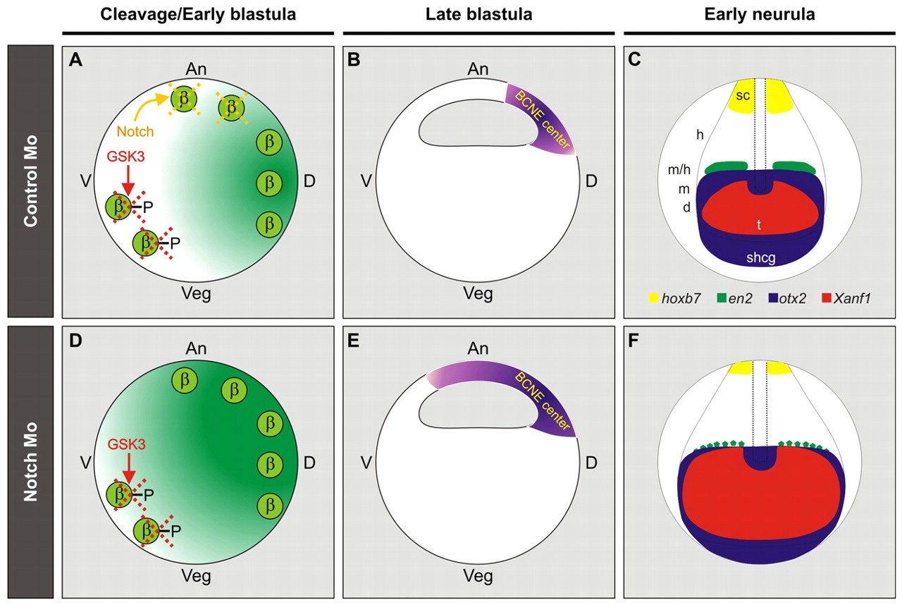 The blastula chordin- and noggin-expressing centre (BCNE) is the predecessor of the Spemann-Mangold's organiser and also contains the precursors of the brain. This signalling centre comprises animal-dorsal and marginal-dorsal cells and appears as a consequence of the nuclear accumulation of β-catenin on the dorsal side. Here, we propose a role for Notch that was not previously explored during early development in vertebrates. Notch initially destabilises β-catenin in a process that does not depend on its phosphorylation by GSK3. This is important to restrict the BCNE to its normal extent and to control the size of the brain.