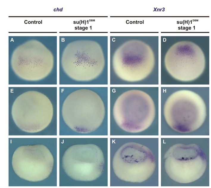 Fig. S2. Attenuation of CSL-mediated Notch signalling does not result in an expansion of BCNE markers on the animal hemisphere. (A-L) Expression of chd (A,B,E,F,I,J) and Xnr3 (C,D,G,H,K,L) at stage 9 in Xenopus embryos injected with 2 ng of su(H)1DBM mRNA prior to the first cleavage (B,F,J,D,H,L) or uninjected sibling controls (A,E,I,C,G,K). A-D are dorsal views. E-H are animal views of the embryos shown in A-D, respectively. I-L are hemisections of the embryos shown in A-D, respectively. The dorsal side is to the right, animal up. |