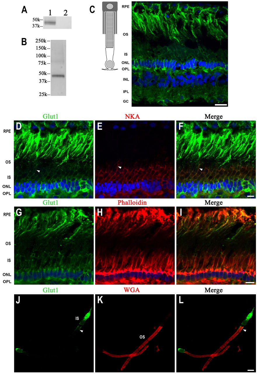 Fig.2. Glut1 immunolocalization in amphibian retina. (A) Western blot analysis of retinal extracts from mouse (lane 1) and Xenopus (lane 2), probed with anti-human Glut1 polyclonal antibody. The Xenopus isoform was not recognized. (B) The polyclonal antibody raised against Xenopus Glut1 specifically recognized this protein in an immunoblot of Xenopus retinal extract. (C) A section of Xenopus retina immunostained for Glut1 (green). Nuclei were counter-stained with Hoechst 33342 (blue). To the left is a schematic of a frog rod photoreceptor with an overlying RPE cell, illustrating the relative positions of individual subcellular compartments. Abbreviations are the same as in Fig. 1. Scale bar: 20 μm. (DâI) Xenopus retinal cryosections stained for Glut1 (green) and Na+/K+-ATPase (NKA, red; DâF) or phalloidin (red; GâI). Glut1 localized to the RPE and its microvilli, and to the rod photoreceptor plasma membrane in the synaptic, nuclear and inner segment layers. Labeling of the Na+/K+-ATPase (DâF) was used as a marker for the photoreceptor inner segment plasma membrane and calycal processes (arrowheads). Labeling of F-actin with phalloidin (GâI) was used as a marker for the RPE microvilli, in addition to the photoreceptor calycal processes. (JâL) Staining of two isolated rod photoreceptor fragments revealed Glut1 (green) on inner segment (IS) membranes and calycal processes (arrowheads) but not along the plasma membrane of outer segments (OS) marked by wheat germ agglutinin (WGA, red). Scale bars: 10 μm (DâL).