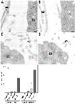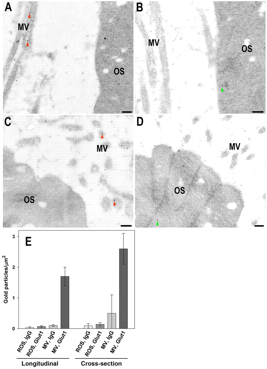 Fig.3. Immunogold analysis of Glut1 in Xenopus retina sections. Longitudinal sections (A,B) and cross-sections (C,D) through Xenopus retina were processed for immunogold analysis. Gold particles (representatives marked by red arrowheads) were abundant on the fingerlike RPE microvilli (A) and their cross-sections (C). Rare, nonspecific particles (green arrowheads) were occasionally found within the rod outer segments, with no preference for the lateral plasma membrane; they were found at similar frequencies in control sections incubated with rabbit IgG control (B,D). (E) Gold particle labeling densities (particles per μm2 of membrane) were calculated for the outer segments and microvilli in both Glut1-stained and control sections. The mean labeling density for each type of structure in ten separate images is plotted with error bars representing 95% confidence intervals. MV, microvilli; OS, outer segment; ROS, rod outer segment. Scale bars: 200 nm.