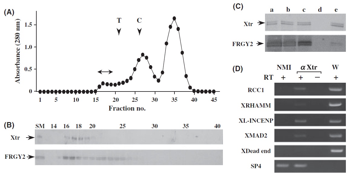 respectively. (B) Western blot analysis of gel-filtrated fractions using anti-Xtr (upper panel) and anti-FRGY2 (lower panel) rabbit antisera.