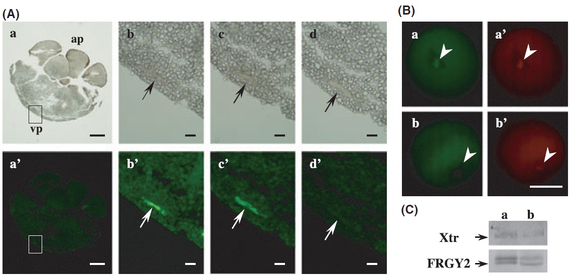 anti-Xtr (upper panel) and anti-FRGY2 (lower panel) rabbit antisera, respectively. Xtr and FRGY2 in supernatant of centrifuged eggs