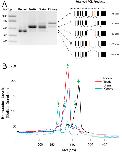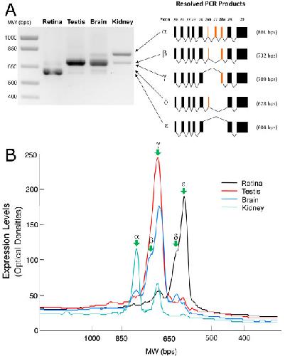 Figure 5. Analysis of the xlProminin-1 alternatively spliced isoforms in four tissues: the retina, brain, testis, and kidney. We found that profiles of the xlProminin-1 alternative splicing are different in these tissues. A: Products of reverse-transcription PCR (RT–PCR) from a region of extensive alternative splicing on the xlProminin-1 gene (exon 20 to 28) were separated on a 1% agarose gel and visualized with ethidium bromide staining. Five discrete PCR products were excised from the gel, cloned, and sequenced. Their exon compositions were determined and each product was designated with a Greek letter (α, β, γ, δ, and ε) for identification when used in the quantitative analysis shown in panel B. The predominant isoforms of xlProminin-1 expressed in the retina lack the alternatively spliced exons 26b, 27, and 28a, whereas the predominant isoform of xlProminin-1 expressed in the kidney retains these exons. The predominant isoforms of xlProminin-1 expressed in the brain and kidney retain exon 28a. Exon 27 was retained only when exon 26b was retained as well. B: Quantification of the xlProminin-1 alternatively spliced isoforms in four tissues: the retina, brain, testis, and kidney. The resolved RT–PCR products were linearly scanned and the optical densities were plotted. Green arrows indicate peaks that represent isoforms resulting from alternative splicing. The major isoform of xlProminin-1 expressed in the retina, ε, lacks the alternatively spliced exons 26b, 27, and 28a, whereas the major form of xlProminin-1 expressed in the kidney, α, retains all possible exons. The majority of xlProminin-1 expressed in the brain and kidney retains exon 28a. |