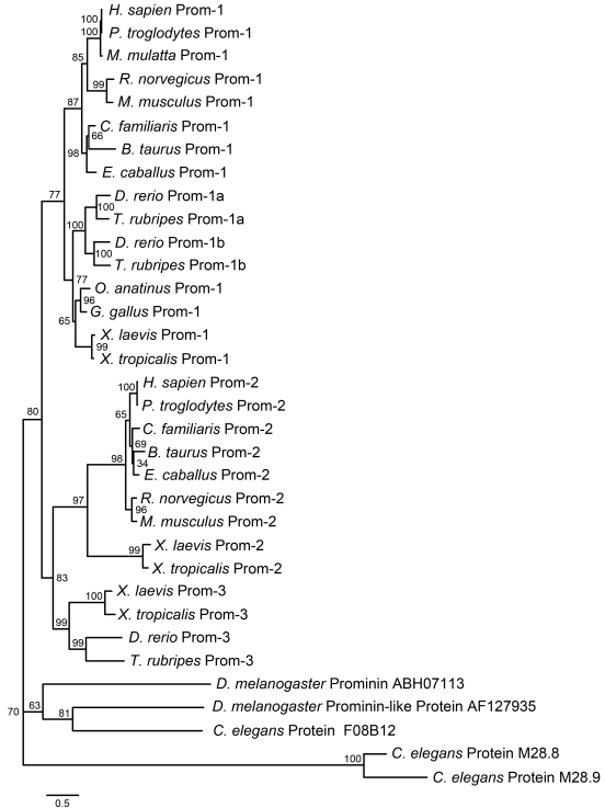 Figure 2. Phylogenic analysis of prominin homologs from several species. This phylogenetic tree was constructed to show the existence of multiple prominin homologs in metazoan animals from fly to human and their evolutionary relationship. Three X. laevis prominin homologs, designated as xlProminin-1, 2, and 3, are placed in branches of the consensus phylogenetic tree with prominin-1, 2, and 3 from other species. The numbers at each node are the percentage bootstrapping values of 100 replicates. The evolutionary distance of any two sequences is represented by the length of the branches. Sequences used in the phylogenetic analysis are excerpted from: H. sapien Prom-1 (NP_006008), P. troglodytes Prom-1 (XP_517115), M. mulatta Prom-1 (NP_001070888), R. norvegicus Prom-1 (NP_068519), M. musculus Prom-1 (NP_032961), C. familiaris Prom-1 (XP_850831), B. taurus Prom-1 (HQ159409), E. caballus Prom-1 (XM_001498729), D. rerio Prom-1a (NP_001108615), T. rubripes Prom-1a (HQ159405), D. rerio Prom-1b (NP_932337), T. rubripes Prom-1b (HQ159406), O. anatinus Prom-1 (HQ159408), G. gallus Prom-1 (XP_001232165), X. laevis Prom-1 (XM_001163920), X. tropicalis Prom-1 (HQ159400), H. sapien Prom-2 (NP_653308), P. troglodytes Prom-2 (XP_001143498), C. familiaris Prom-2 (XP_854455), B. taurus Prom-2 (XP_599188), E. caballus Prom-2 (XP_001494215), R. norvegicus Prom-2 (AAN63818), M. musculus Prom-2 (NP_620089), X. laevis Prom-2 (NP_001163922), X. tropicalis Prom-2 (HQ159402), X. laevis Prom-3 (NP_001163921), X. tropicalis Prom-3 (HQ159403), D. rerio Prom-3 (XP_684527), T. rubripes Prom-3 (HQ159407), D. melanogaster Prominin (ABH07113), D. melanogaster Prominin-like protein AF127935 (NP_647770), C. elegans protein F08B12 (NP_509907), C. elegans protein M28.8 (NP_496294), C. elegans protein M28.9 (NP_496296). |