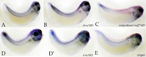 Fig. S3. Later stage, Xbra, Antipodean and pδN63 myotomal phenotypes. (A-E) Injection (one cell of a 2-cell embryo) of an MO against xbra RNA had little effect on myoD expression (B, versus uninjected in A), whereas the antipodean/vegT MO caused a decrease in myoD expression (C), as expected (see Fukuda et al., 2010). Embryos were fixed and stained at stage 25. Together, the xbra and antipodean/vegT MOs had a similar effect on myoD expression as the antipodean/vegT MO alone (D, uninjected side; Dâ², injected side). A similar decrease in myoD RNA levels was observed in deltaNp63 RNA-injected embryos (E, injected side). |