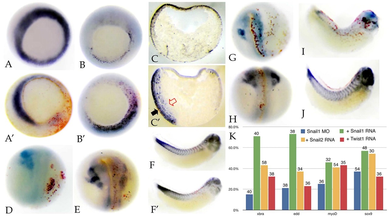 Fig. 2. snail1 MO effects on germ layer markers. (A-Bâ²) snail1 MO injection (into one cell of a 2-cell embryo) led to the loss of expression (as measured by in situ hybridization) of xbra (Aâ², versus control in A) and to an increase in endodermin (edd) (Bâ², versus control in B) RNA levels (at stage 11). (C,Câ²) Section analysis revealed that the edd expression domain, which is restricted to the superficial region in control embryos (C), extends deeper into the mesodermal region in snail1 MO-injected embryos (Câ², black arrow indicates lacZ marker staining, and the red arrow indicates the extent of edd staining in deep mesodermal tissue). (D-Fâ²) There was a loss of expression of the neural crest/placodal marker sox9 at stage 17/18 (D, severely affected; E, mildly affected; injected sides to the right), as well as a loss of expression of myoD at stage 25, as expressed in myotomal muscle, a mesodermal derivative (Fâ², versus control in F). (G-J) The effects on sox9 (G,H) and myoD (I,J) of snail1 MO injection (G,I) were rescued by the injection of the Snail1-GFP RNA (H,J), which lacks the snail1 MO target sequence. Injected sides are shown. (K) The percentage of normal embryos plotted with respect to xbra, edd, myoD and sox9 in situ expression. Blue, snail1 MO injected; green, snail1 MO together with snail1 RNA (600 pg/embryo); yellow, snail1 MO together with Snail2-GFP RNA (600 pg/embryo); red, snail1 MO together with Twist1-GFP RNA (600 pg/embryo). The number of embryos examined is indicated above each bar. |