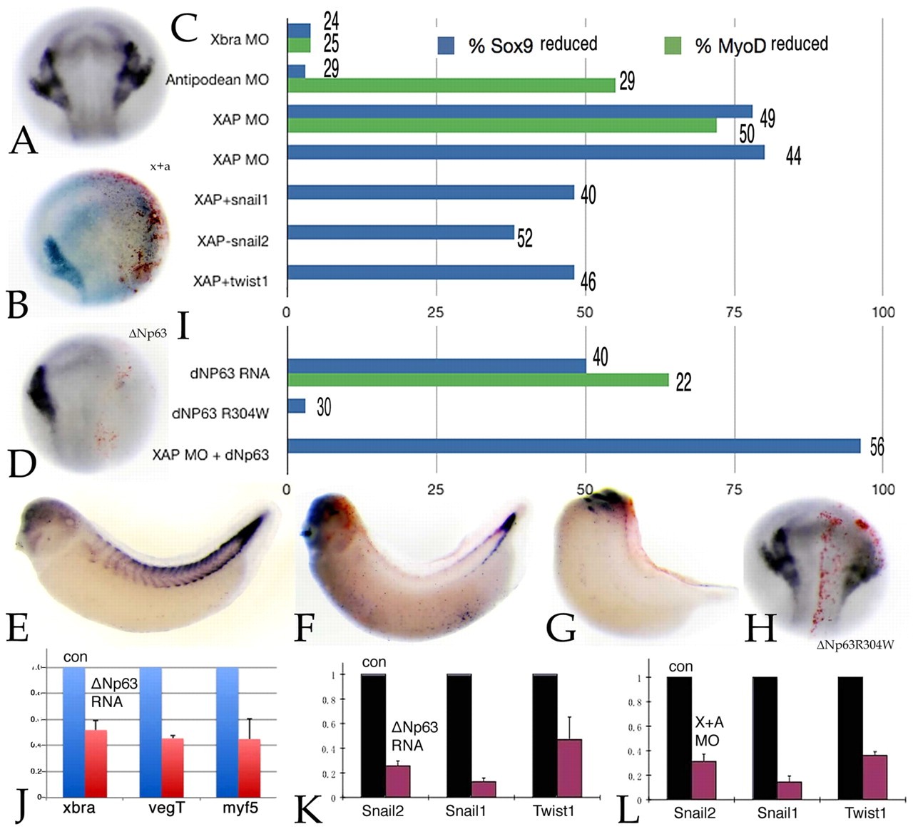 Fig. 3. Loss of mesoderm leads to loss of neural crest. (A,B) Injection of the xbra MO has little effect on myoD (stage 25) or sox9 (stage 17/18) expression. Injection of the antipodean/vegT MO causes a decrease in myoD expression (Fukuda et al., 2010), but little effect on sox9 expression (data not shown). Together (XAP), the xbra and antipodean/vegT MOs block sox9 (stage 17/18) (B, versus control in A) and myoD (data not shown) expression. (C) The percentage of embryos with loss of myoD or sox9 staining, with the number of embryos examined shown at the end of each bar. Injection of snail1, snail2 or twist1 RNAs (600 pg/embryo) produced a modest rescue of sox9 expression in XAP morphant embryos. (D-G) Injection of 600 pg δNp63 RNA into one cell of a 2-cell embryo led to the loss of sox9 (D), xbra (not shown) and myoD (F, moderate effect; G, severe effect; versus control in E) expression in â¼50% of embryos. (H) Injection of RNA encoding the mutated and inactive δNp63R304W protein had no effect on sox9 or myoD (data not shown) expression. (I) Quantitative presentation of the data shown in D-H. (J-L) qPCR analyses of δNp63 RNA-injected embryos (both cells of 2-cell embryos injected, analyzed at stage 11) revealed a substantial decrease in the levels of the xbra, vegT/antipodean and myf5 mesodermal marker RNAs (J). In both δNp63 RNA (K) and XAP MO (L) injected embryos, there were similar decreases in the levels of snail2, snail1 and twist1 RNAs. Error bars indicate s.d. |
